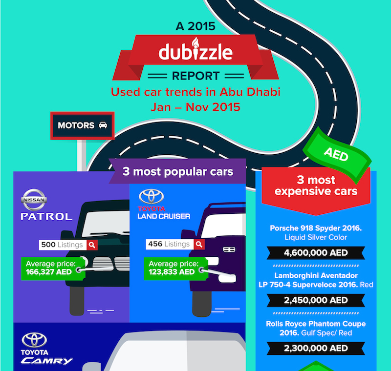 Figures gathered between January and November this year reveal the number of car ads placed on dubizzle Abu Dhabi at over 125k with the Nissan Patrol recorded as the top car model sold on dubizzle during this time, with an average pricing of AED 166,327 and over 500 listings.