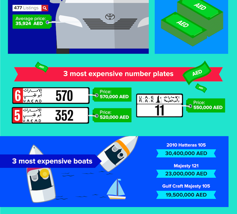 Luxury yachts also topped this years report as the most expensive items listed on dubizzle from Abu Dhabi, with a 2010 Hatteras 105 posted on the site for a whopping AED 30.4 million.