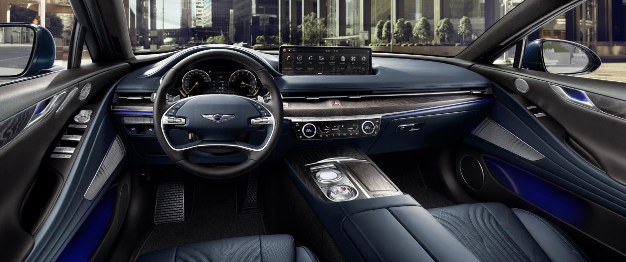 G80’s leading interior space has been further developed. Both headroom and legroom were increased by lowering the seating height of the second row, allowing for both more interior room and a more dramatic roofline. Completing the space, the G80 features leather seating, steering wheel surfaces, soft-touch fabrics and coatings as well as open pore wood trim finishes.