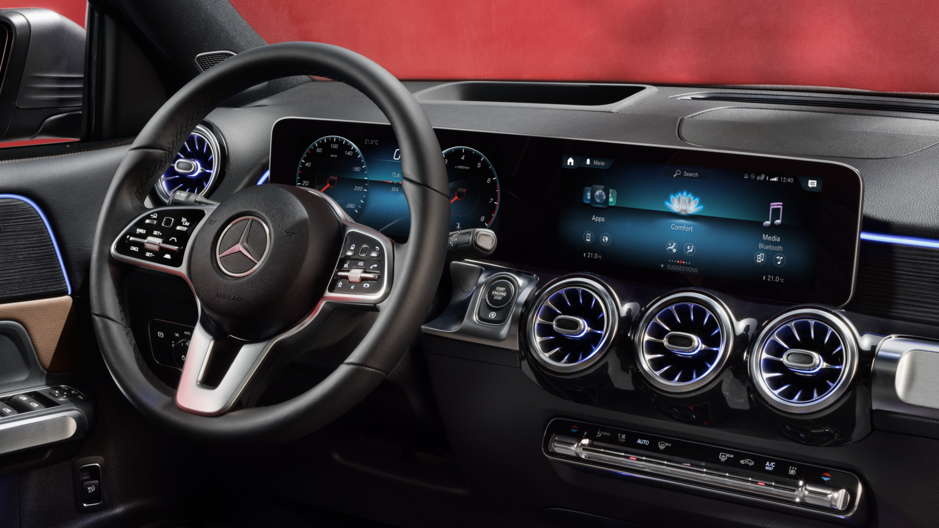 The interior of the new GLB is astonishingly generously appointed and strikingly elegant. Eye-catching features include highlights such as the free-standing Widescreen Cockpit, the pleasant ambient lighting as well as distinctive SUV design elements.