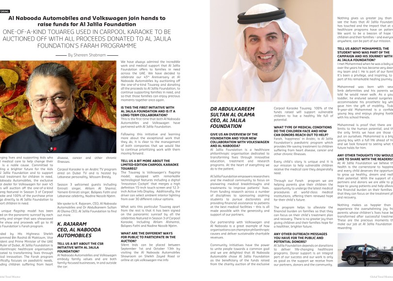 Our partnership with Volkswagen and Al Nabooda is a great example of how organisations can champion philanthropic causes and deliver sustainable charitable revenues. Community initiatives have the power to unite people towards a common goal and we are delighted that Al Nabooda Automobile chose Al Jalila Foundation as the beneficiary of the funds raised from the charity auction of the exclusive Carpool Karaoke Touareg. 100% of the funds raised will support vulnerable children to live a healthy life full of potential.