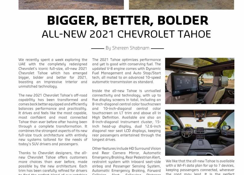 We recently spent a week exploring the UAE with the completely redesigned Chevrolet’s iconic full-size, all-new 2021 Chevrolet Tahoe which has emerged bigger, bolder and better for 2021, boasting an impressive interior and unmatched technology.