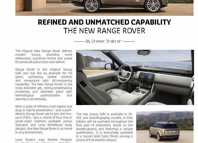 Range Rover is the original luxury SUV and has led by example for 50 years, combining serene comfort and composure with all-conquering capability. The New Range Rover is the most desirable yet, mixing breathtaking modernity and aesthetic grace with technological sophistication and seamless connectivity.