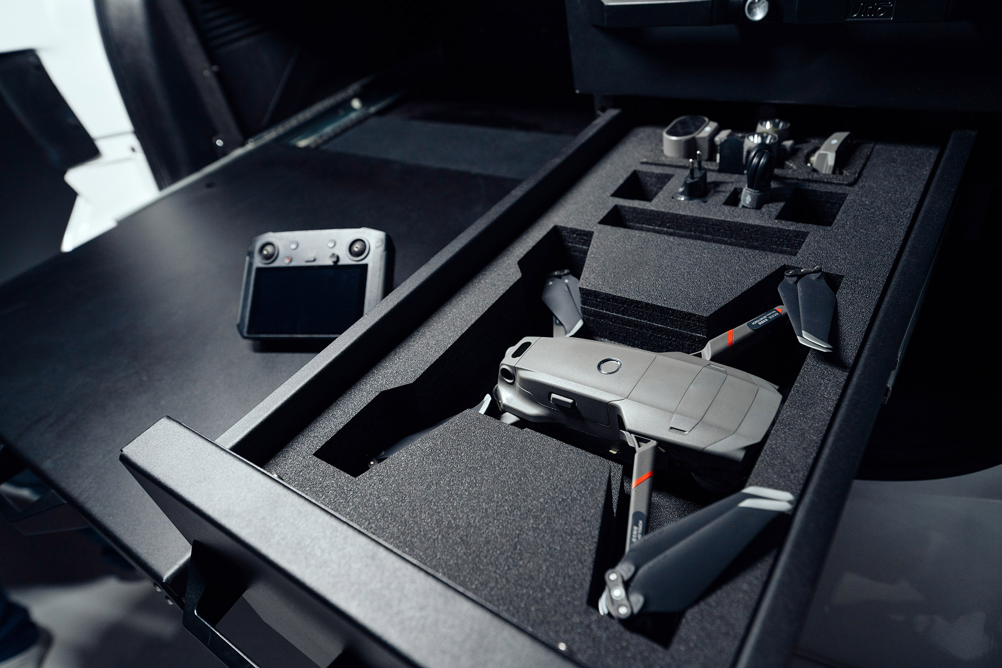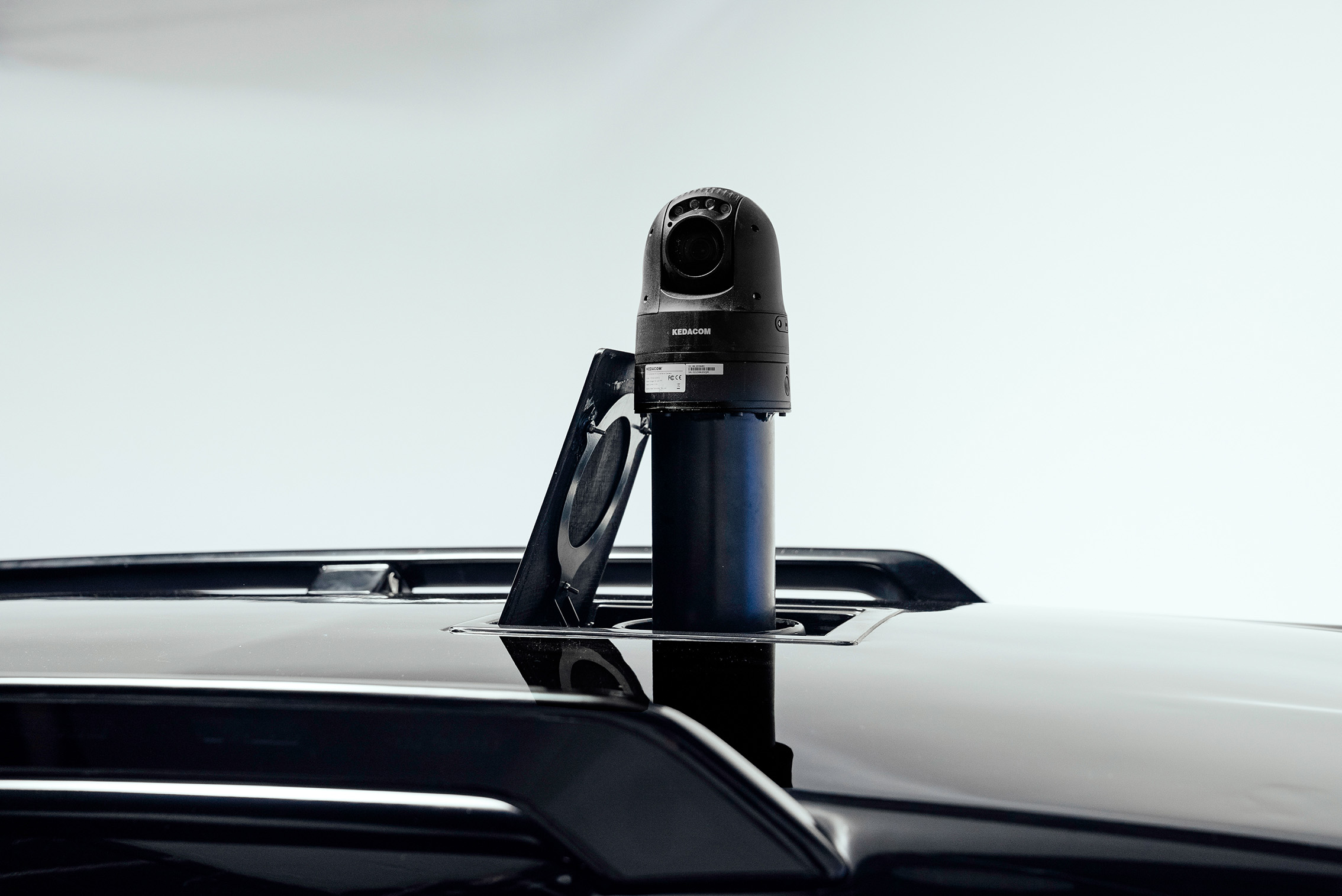 The interior was designed around the comfort and needs of police officers, with an integrated 16-inch central screen, a powerful onboard computer linked to the main control centre, a large passenger display, an android tablet connected to the dispatcher, a driver behaviour camera, in-cabin monitoring and front ADAS. The Ghiath Smart Patrol also features a custom-built rear bench, grills, a protective cage, a specially designed compartment in the boot to store rescue and safety equipment, as well as a custom-built drone box with an advanced drone on board.