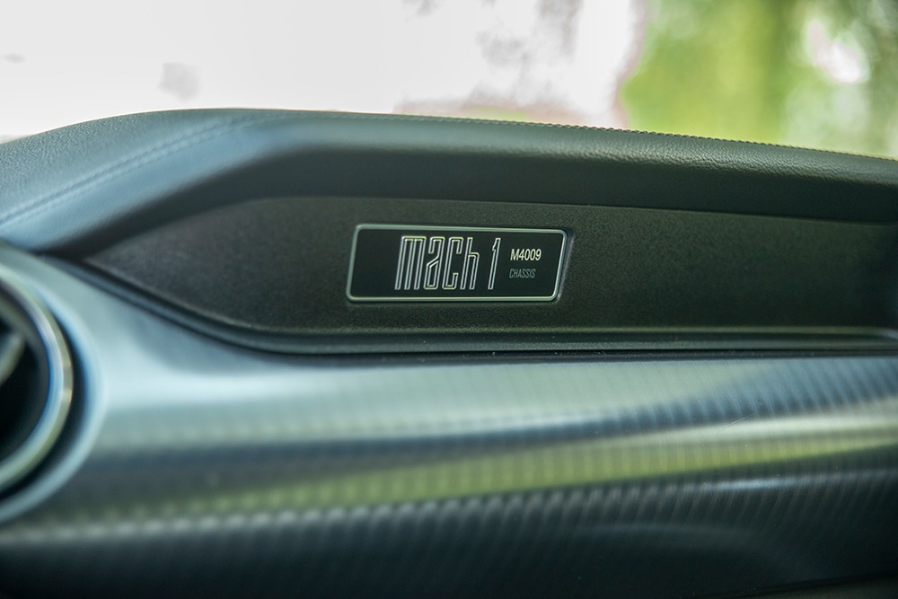 Inside, leather sports seats feature Metal Grey stitching, each Mustang Mach 1 interior includes a dashboard badge with Mach 1 logo and build number. Standard comfort and convenience technologies include heated and cooled front seats and a premium 12-speaker B&O Sound System.