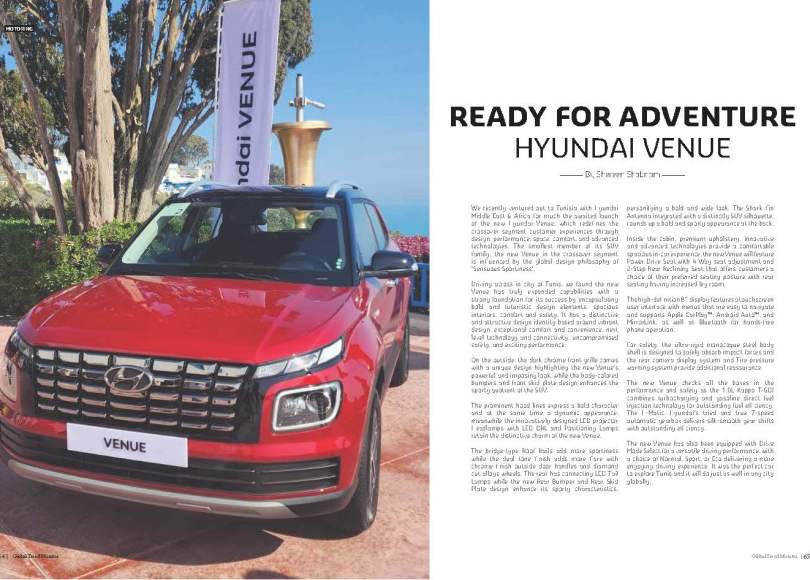 Driving across in city of Tunis, we found the new Venue has truly expanded capabilities with a strong foundation for its success by encapsulating bold and futuristic design elements, spacious interiors, comfort and safety. It has a distinctive and attractive design identity based around vibrant design, exceptional comfort and convenience, next level technology and connectivity, uncompromised safety, and exciting performance.
