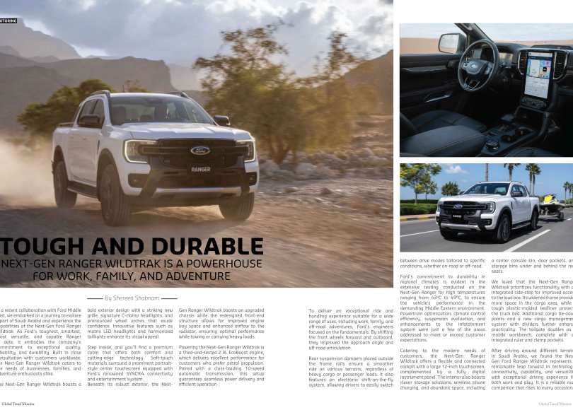 After driving around different terrains in Saudi Arabia, we found the Next-Gen Ford Ranger Wildtrak represents a remarkable leap forward in technology, connectivity, capability, and versatility with exceptional driving experience for both work and play. It is a reliable road companion that rises to every occasion.