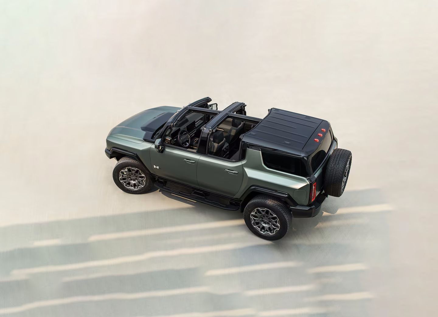 Gone are the boxy, utilitarian looks of yesteryear that we were used to when we went for meetings in the orange office Hummer. The new Hummer EV ushers in a sculpted, futuristic silhouette while still channeling the iconic Hummer attitude. Up front, a glowing HUMMER EV light bar leads the charge alongside IntelliBeam LED headlamps and a power-operated hood. The Infinity Roof with removable sky panels adds an open-air thrill that is perfect for cruising under the Dubai skyline. Rugged details like 18” black aluminum wheels with machined accents, full underbody armor, and extreme off-road components ensure it’s as ready for the desert dunes as it is for downtown.