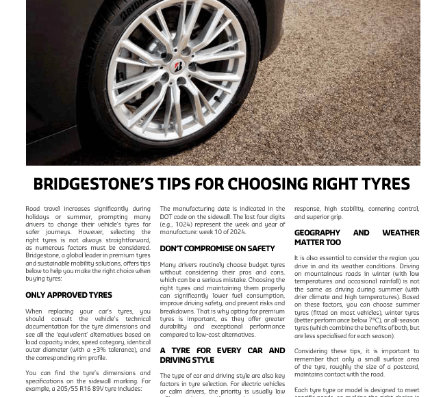 Road travel increases significantly during holidays or summer, prompting many drivers to change their vehicle’s tyres for safer journeys. However, selecting the right tyres is not always straightforward, as numerous factors must be considered. Bridgestone, a global leader in premium tyres and sustainable mobility solutions, offers tips below to help you make the right choice when buying tyres:
