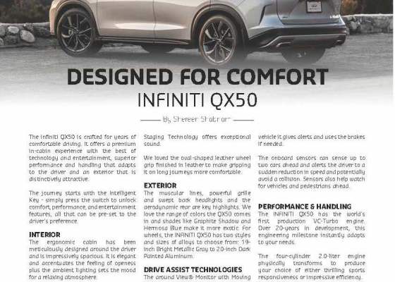 By Shereen Shabnam The Infiniti QX50 is crafted for years of comfortable driving. It offers a premium in-cabin experience with