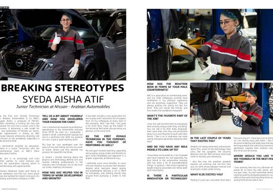 Syeda Aisha Atif – Junior Technician at Nissan – Arabian Automobiles As the first ever Female Technician at Arabian Automobiles &